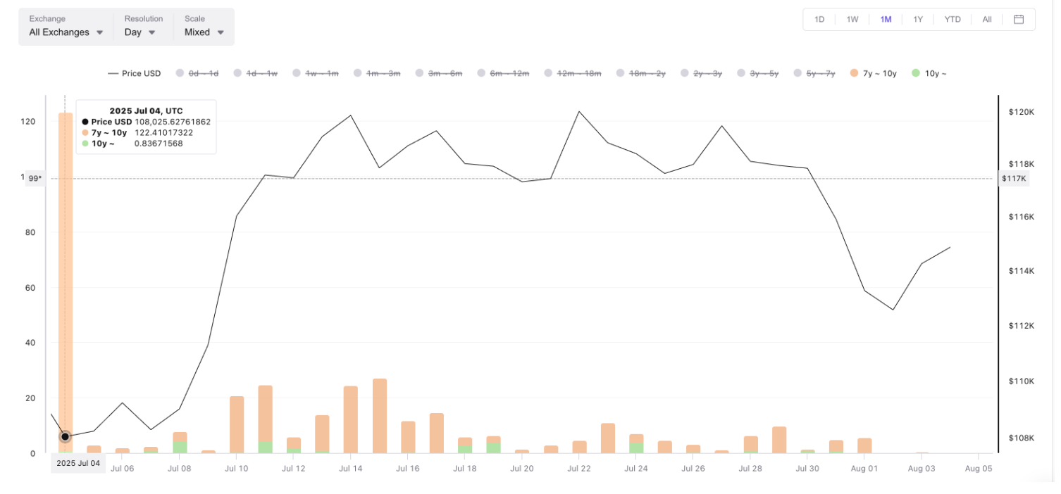 Динамика продаж: С 23 июля по 1 августа появилось расширение Spent Output Bands для токенов с возрастом 7-10 лет, что показывает, что адреса Биткойна, которые были в спячке почти десять лет, начали осуществлять сделки. Похожая ситуация наблюдалась с 10 по 19 июля, что привело к падению BTC с 123,000 долларов до 117,000 долларов.