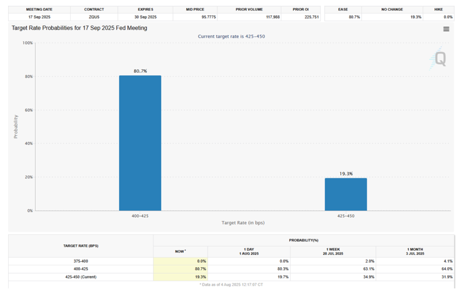 Согласно последним данным инструмента CME FedWatch, рынок ставит вероятность снижения процентной ставки ФРС на заседании 17 сентября на уровне 80,7%. Данные на этой неделе будут постоянно корректировать это ожидание, становясь основным драйвером колебаний Биткойна.