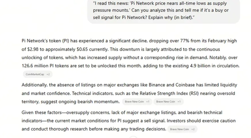 Искусственный интеллект не идеален — это всего лишь инструмент, а не хрустальный шар. Попробуйте протестировать его советы с помощью небольших сделок или бумажной торговли (симуляция торговли без реальных денег). Со временем вы можете настроить свои подсказки для получения лучших результатов. Пример продвинутой подсказки: «Проанализируйте эту новость — „С увеличением давления со стороны поставок цена Pi Network приближается к историческому минимуму“ — и дайте мне сигнал на покупку/продажу с оценкой уверенности."