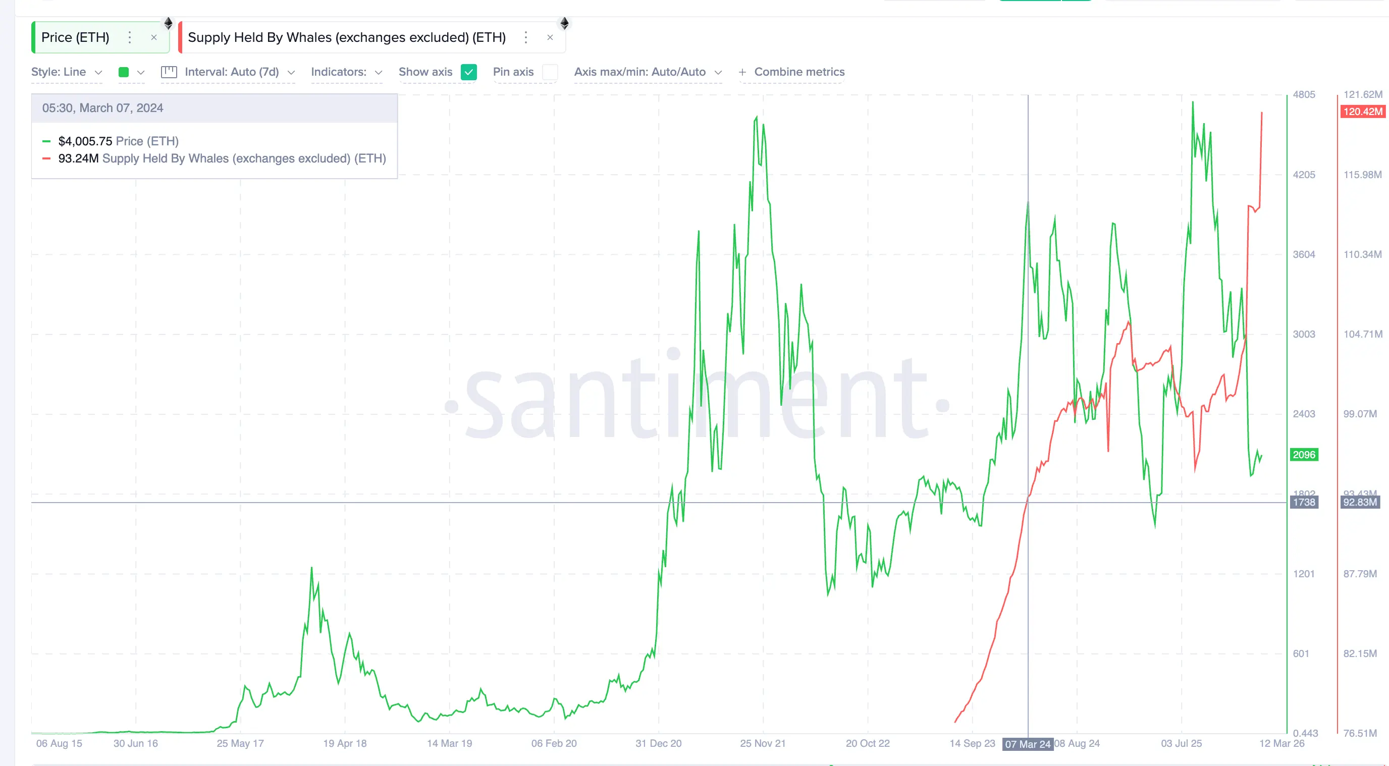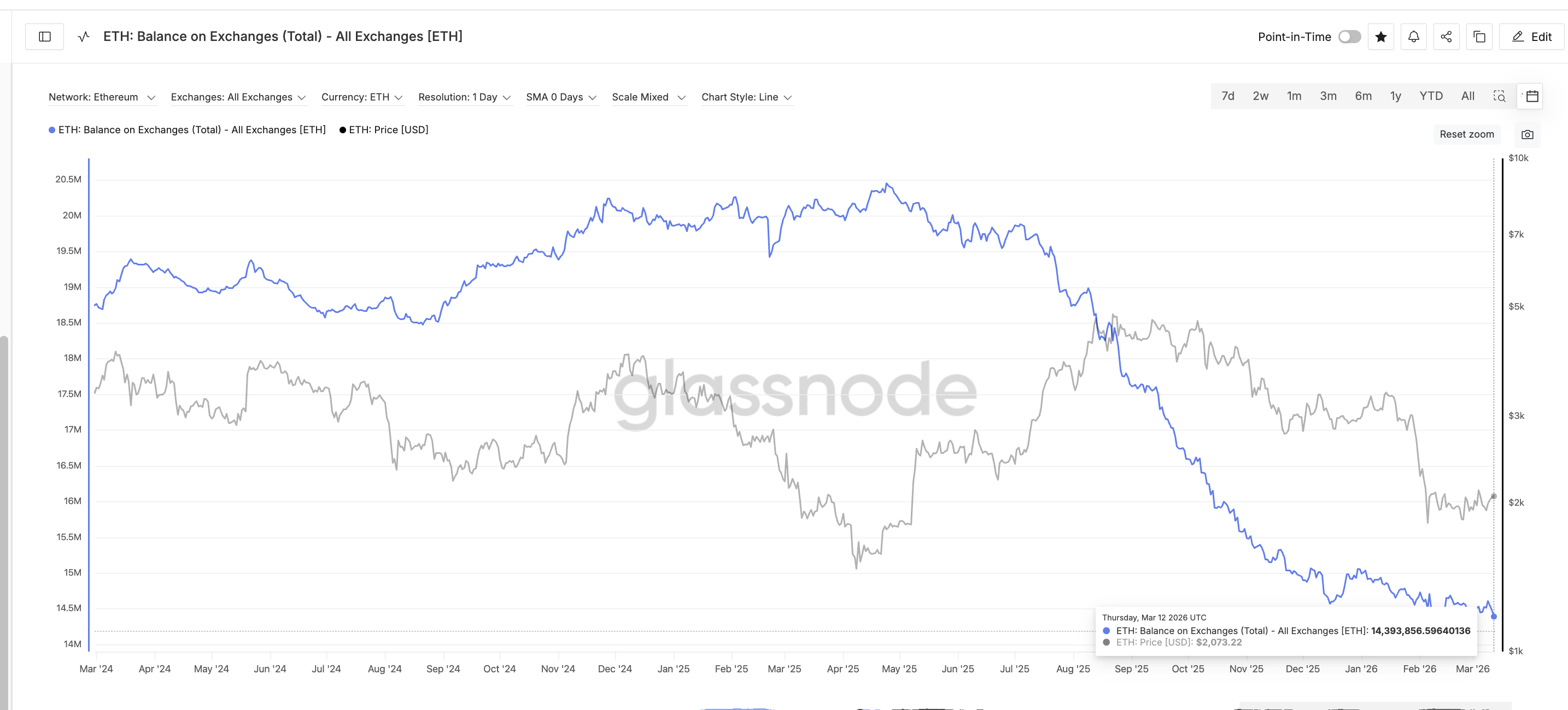 Несмотря на слабую цену, поведение держателей показывает важную тенденцию. С марта 2024 года, когда активизировалась тема токенизации, количество ETH у китовых кошельков (без учета биржевых резервов) выросло с 93,24 миллиона до 120,42 миллиона — рост на 29%. За тот же период запасы на биржах снизились с 18,76 миллиона до 14,39 миллиона — снижение на 23%.