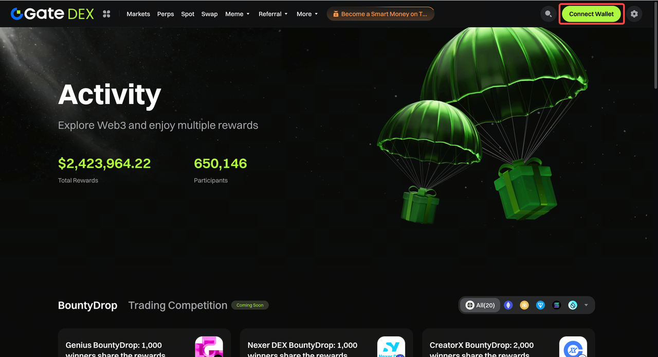 After entering the Gate Web3 BountyDrop webpage, click the [Connect Wallet] button in the top right corner.