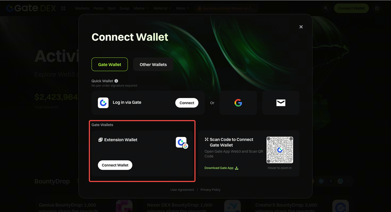 Please select the Gate Wallet extension to connect. The web version currently only supports participation in BountyDrop using the Gate Wallet extension; other wallets are not supported at this time.