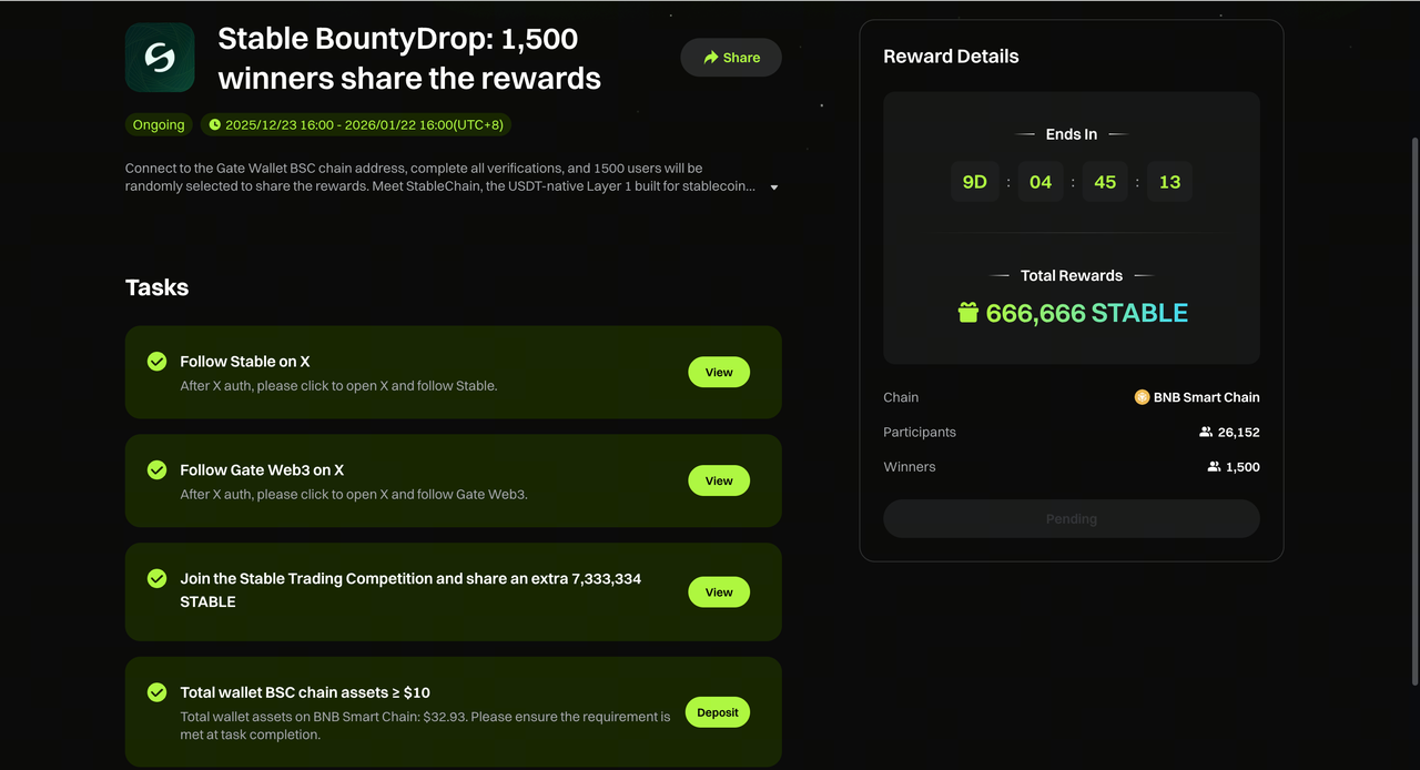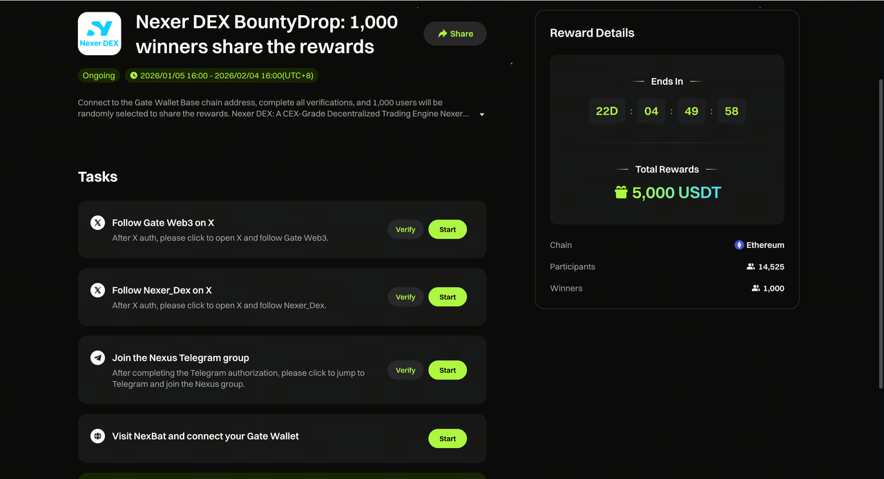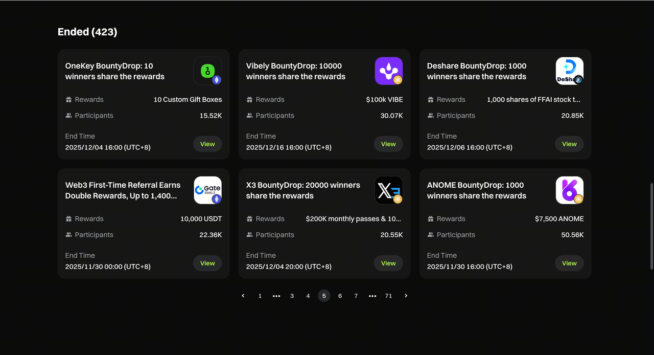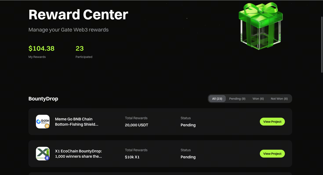 Gate Web3 BountyDrop is a one-stop hub that gathers the most popular airdrop projects, offering users a fast-track entry into interactive tasks. Users can easily browse the latest airdrop projects, view project overviews, the interaction process, participation timeframes, and directly access project pages through task links to participate. Users can enter the BountyDrop platform through Gate Web3 and freely participate in interactive tasks for various projects, increasing the chances of receiving diverse airdrop rewards.
