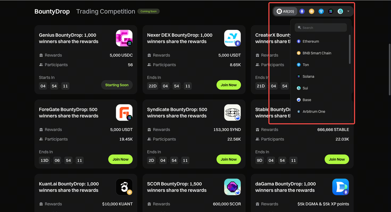 In the "Ongoing" list, users can view available projects, including project name, reward amount, event period, and other key information. If using a private key wallet or participating in projects on specific blockchains, you can filter by chain to view the corresponding projects.