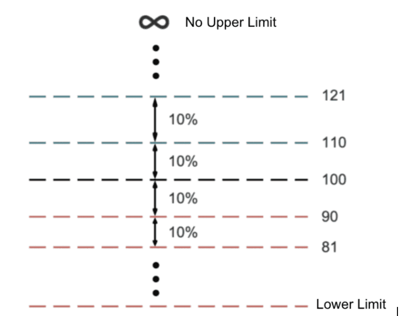 Create an Infinite Grid when the price of 1GT is 100 USDT, and set the rate of return per grid at 10%. You have 10GT (equivalent to 1000 USDT). When the price of 1GT rises to 110USDT, the value of the GT you hold is 1100USDT. To maintain the value of the GT held at 1000 USDT, 100 USDT worth of GT will be sold and the amount of GT you hold will be reduced to 8.9. If the price of GT continues to rise, the bot will continue to sell the extra amount of GT but will never sell all GT because the value of GT held should be maintained at 1000 USDT.