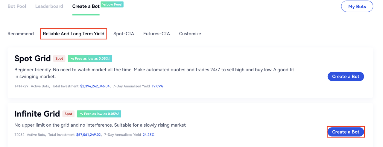 Homepage - Bots - Bot Pool - Create a Bot - Reliable And Long Term Yield- Infinite Grid - Create a Bot - Set Parameters - Create