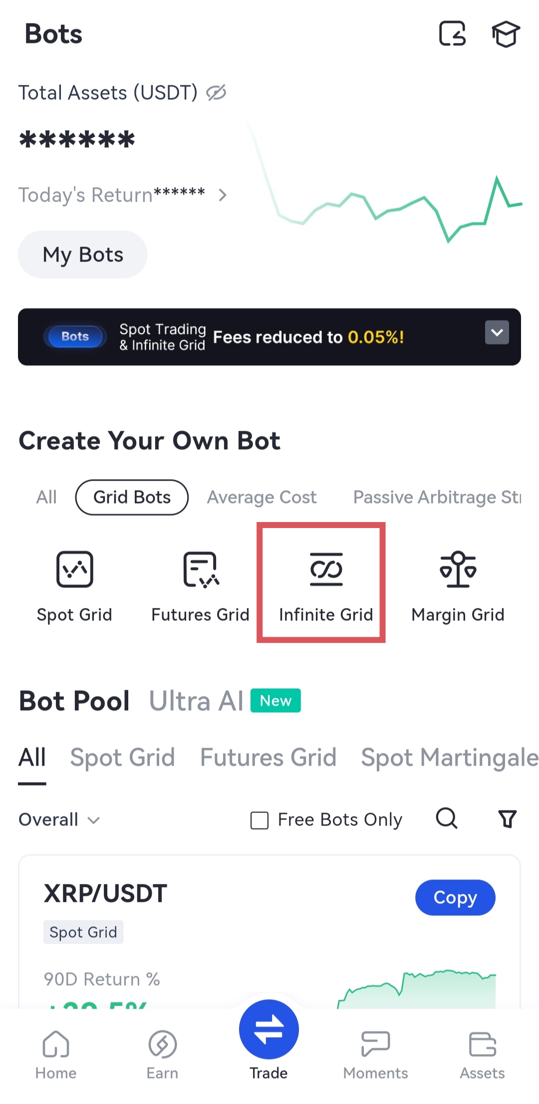 Homepage - Trade - Bots - Grid Bots - Infinite Grid - Choose Markets - Recommended/Customize - Create