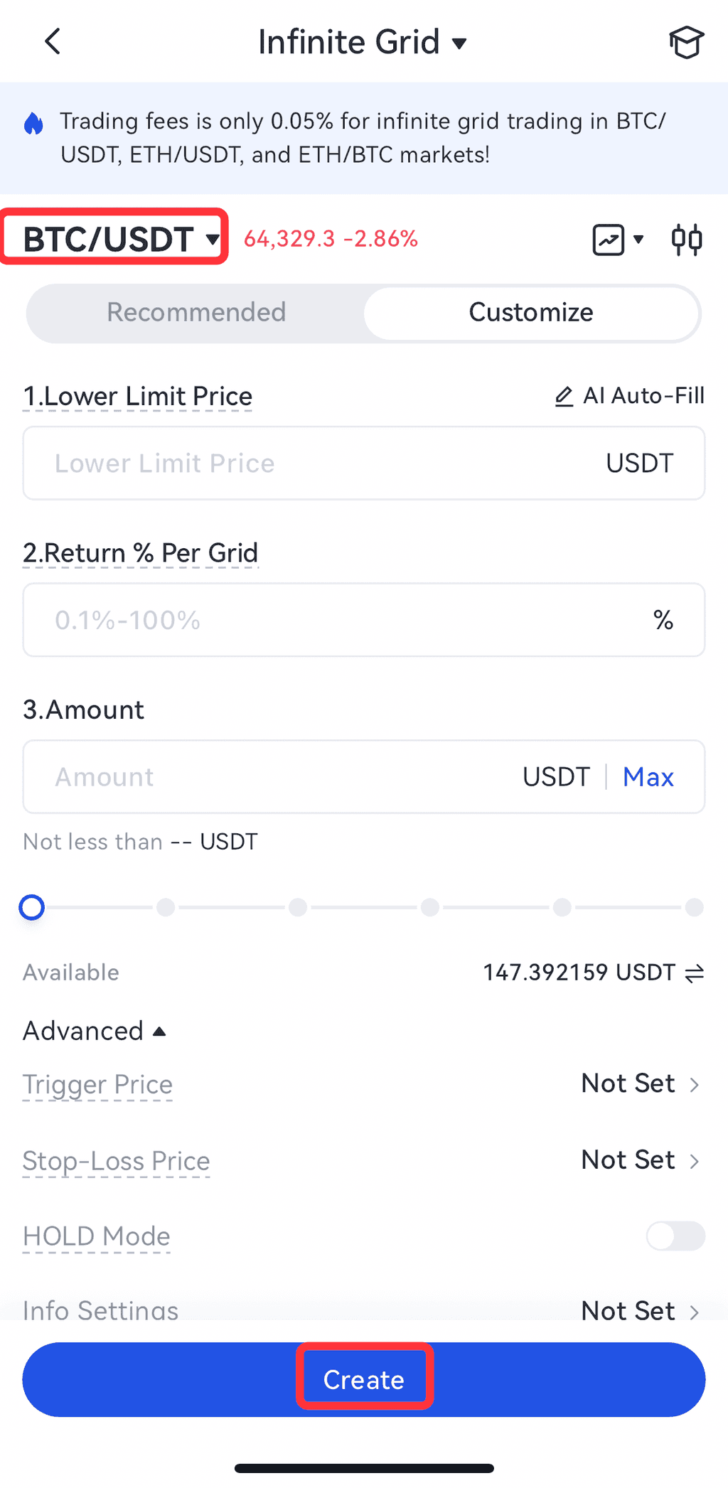 Infinite Grid is an advanced version of the Spot Grid. Unlike Spot Grid, Infinite Grid does not require users to set the highest price. This allows users to hold their tokens in volatile and rising markets and ensures that traders never miss chances.