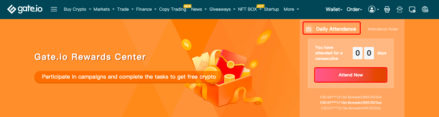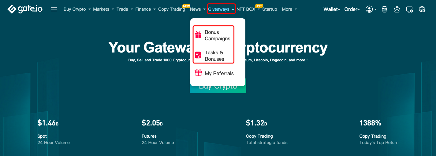 1. Adım: Hesabınıza giriş yapın ve Gate Ödül Merkezine girmek için "Hediyeler"-"Bonus Kampanyaları" veya "Görevler ve Bonuslar" bölümüne gidin.