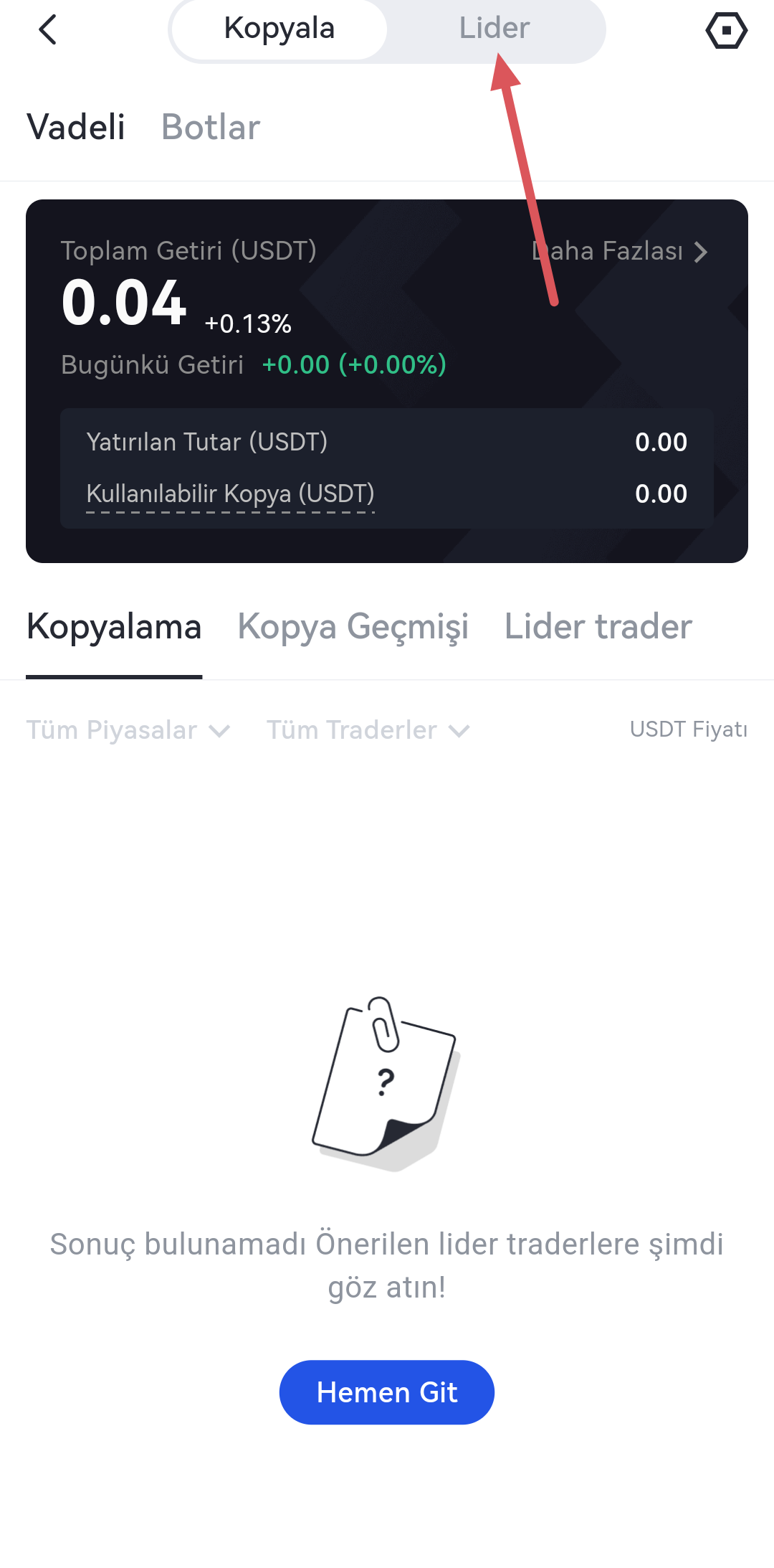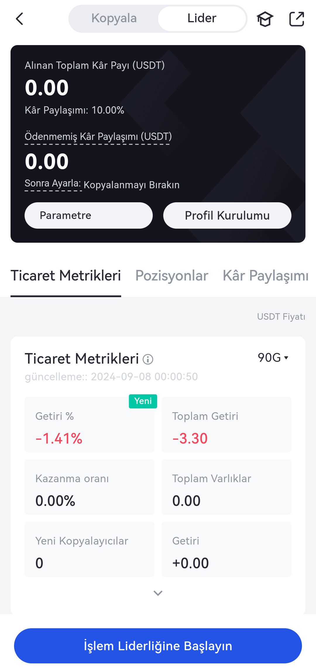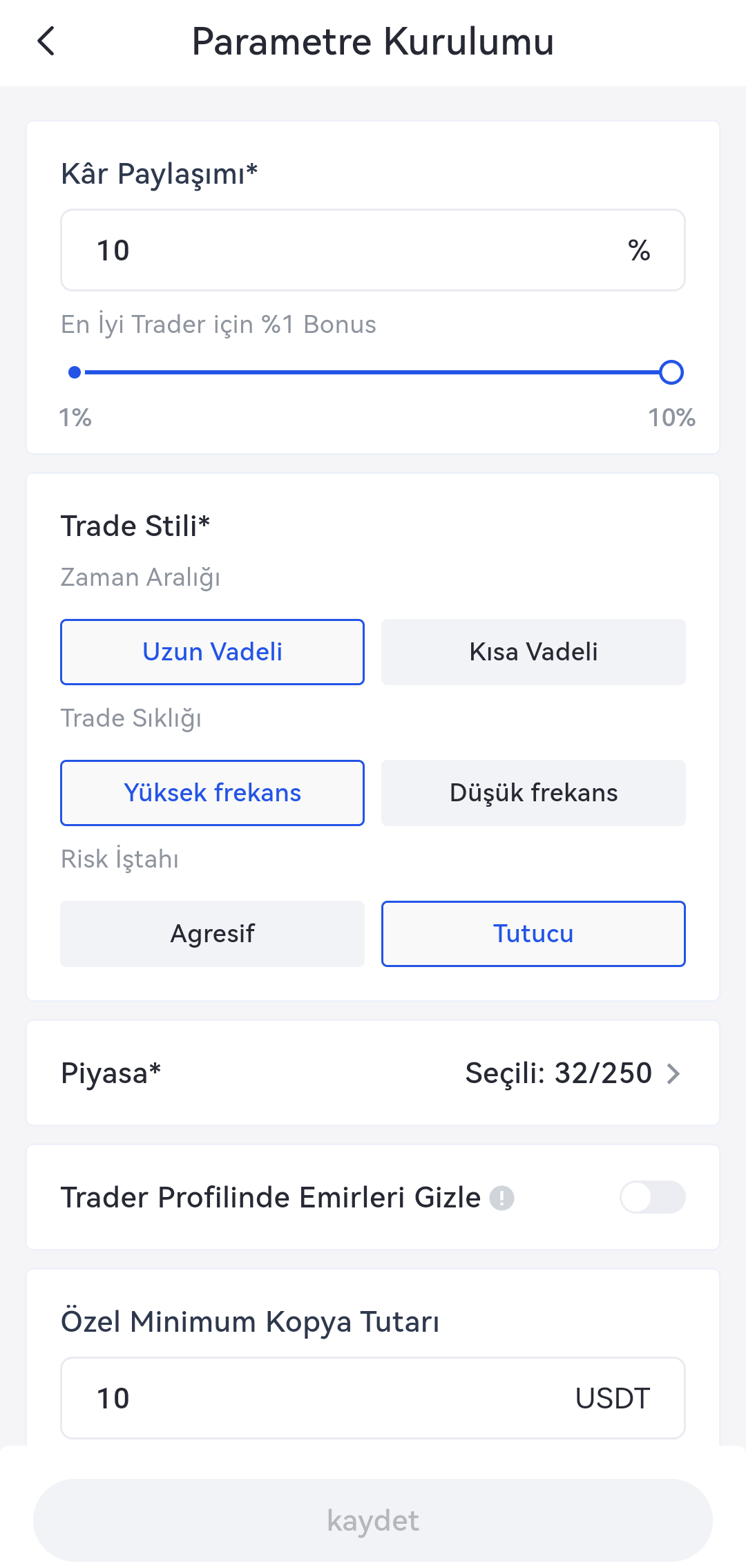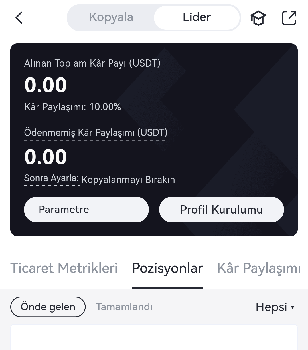UYGULAMA: “ Copy Trading” ana sayfasına girin - “Kopyalarım ‘a tıklayın - ’Lead ‘i seçin - ’Lider Parametrelerim ”e tıklayın - parametreleri ayarlayın - liderliği başlatın.