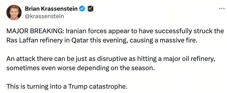 Ras Laffan Industrial City handles nearly all of Qatar’s LNG exports, with Qatar holding about 20% of global LNG trade. This means the attack directly results in about 3-4% of global LNG supply (20% × 17%) being phased out over the coming years.