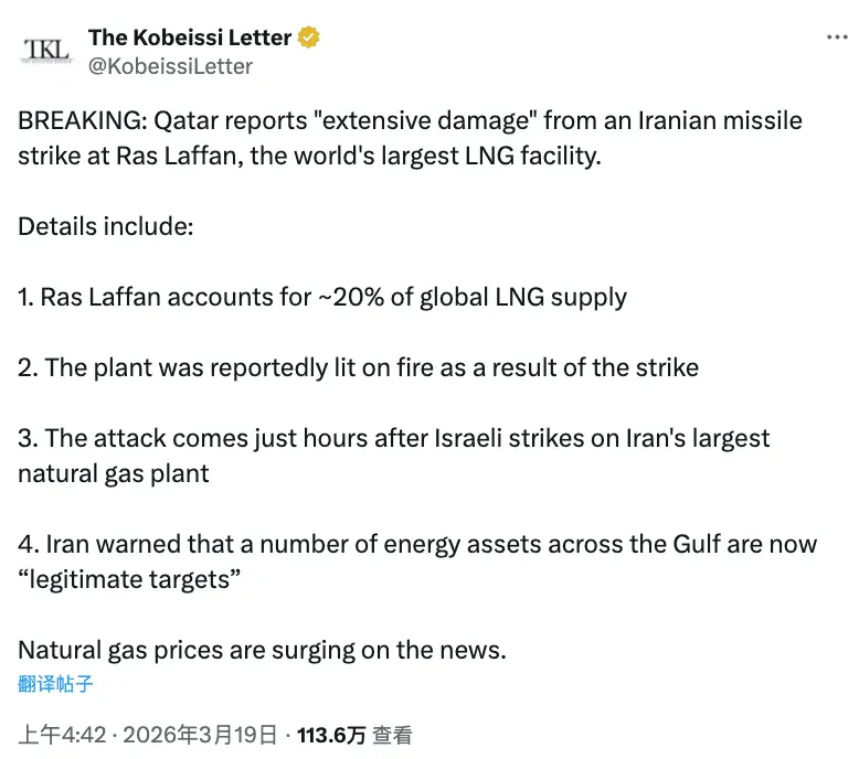 On March 18-19, 2026, Qatar’s Ras Laffan Industrial City, the world’s largest liquefied natural gas (LNG) export hub, was hit by missile attacks, severely damaging key production facilities. This is the first time in the Middle East conflict that a world-class energy export infrastructure has been directly targeted, marking an escalation from maritime blockade tensions to direct strikes on production sites.