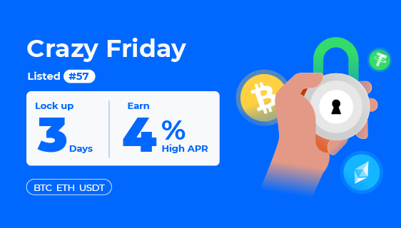 Ця фаза Crazy Friday дозволяє блокувати BTC/ETH/USDT лише на 3 дні. Річна процентна ставка досягає 4%, а загальна квота підписки обмежена та обслуговуватиметься в порядку черги!