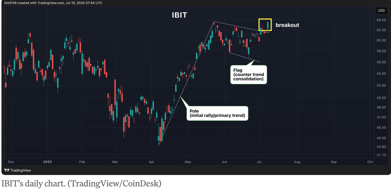 Прапор зростання є визнаною формою продовження бичачого ринку. Згідно з методом вимірювання цілей в технічному аналізі метод вимірювання (Measured Move Method), потенційний обсяг зростання після прориву зазвичай дорівнює обсягу початкового зростання (тобто “штанги”), що відбувся перед формуванням конфігурації. Ця модель прогнозує, що як IBIT ETF ціна, так і спотова ціна Біткойна ($BTC) мають принаймні 30% простору для зростання.