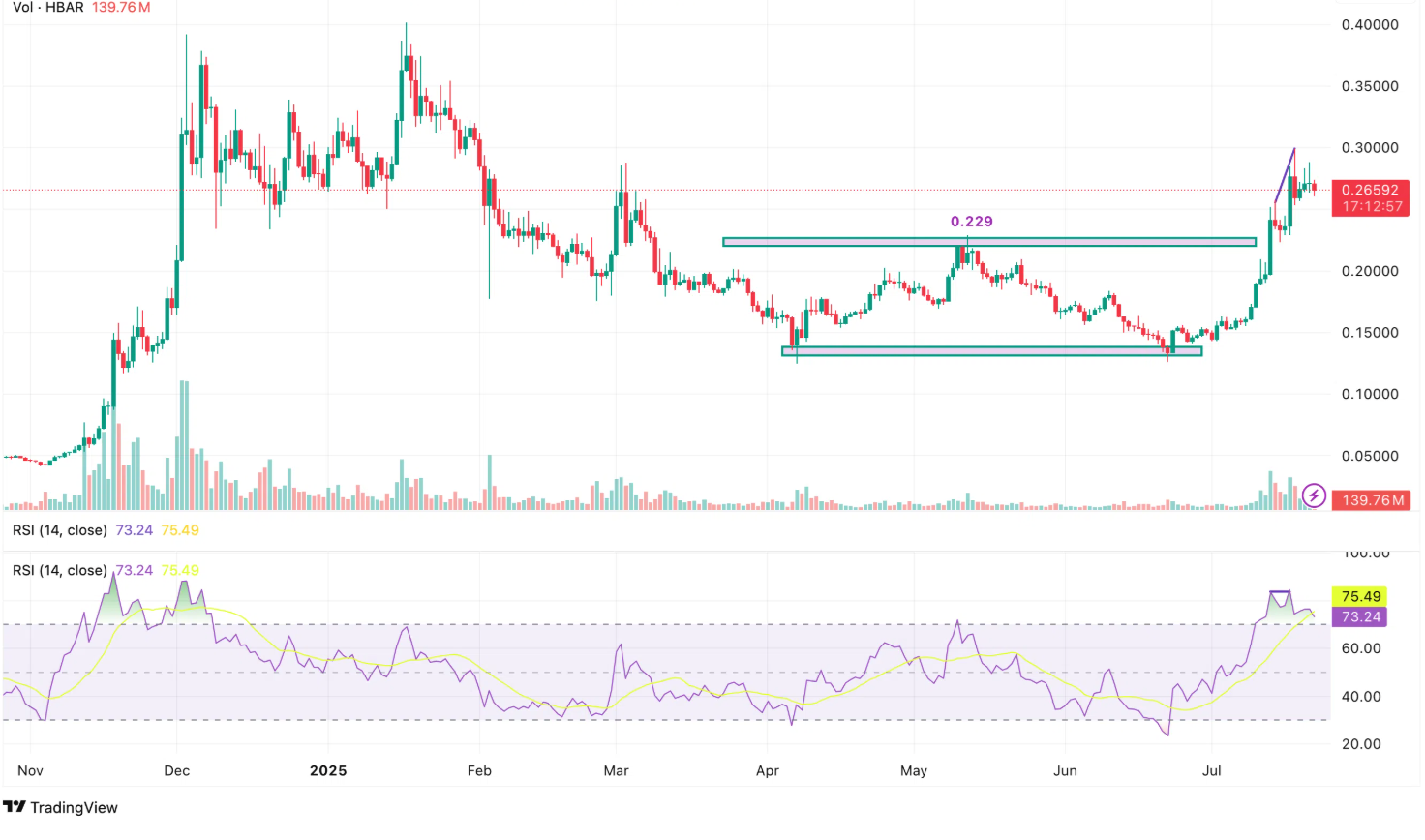 Ціна Hedera (HBAR) 18 липня подолала рівень шийки подвійного дна $0.229, після чого різко зросла до $0.299, протестувавши попередній максимум на початку травня. Це зростання означає, що з моменту прориву ціна HBAR виросла приблизно на 30%.