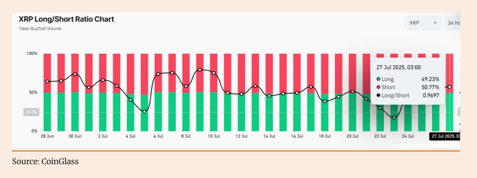 Дані CoinGlass показують, що станом на 27 липня співвідношення довгих і коротких позицій (Long/Short Ratio) для XRP становить 0,96, тобто частка коротких позицій досягає 50,77%, тоді як довгі становлять лише 49,23%. Ці дані свідчать про те, що учасники ринку схиляються до ставок на падіння цін.