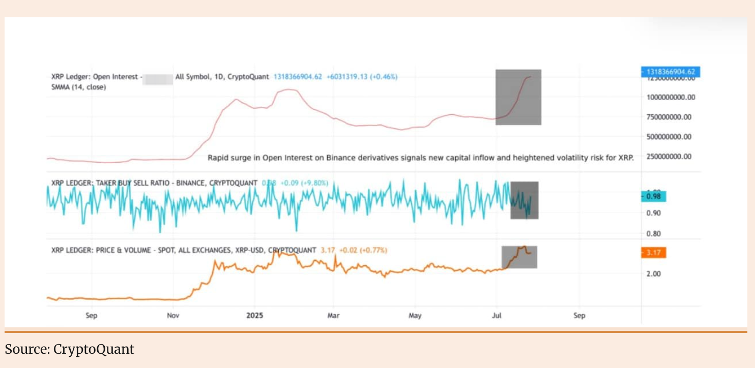 Дані CryptoQuant показують, що незакриті контракти (Open Interest) XRP на основних CEX досягли історичного максимуму на початку цього тижня, приблизно $3.9 мільярда, а потім знизилися до поточних $3.08 мільярда. Ці дані відображають значний приплив нових коштів на ринок похідних, що свідчить про високу активність ринкових настроїв.