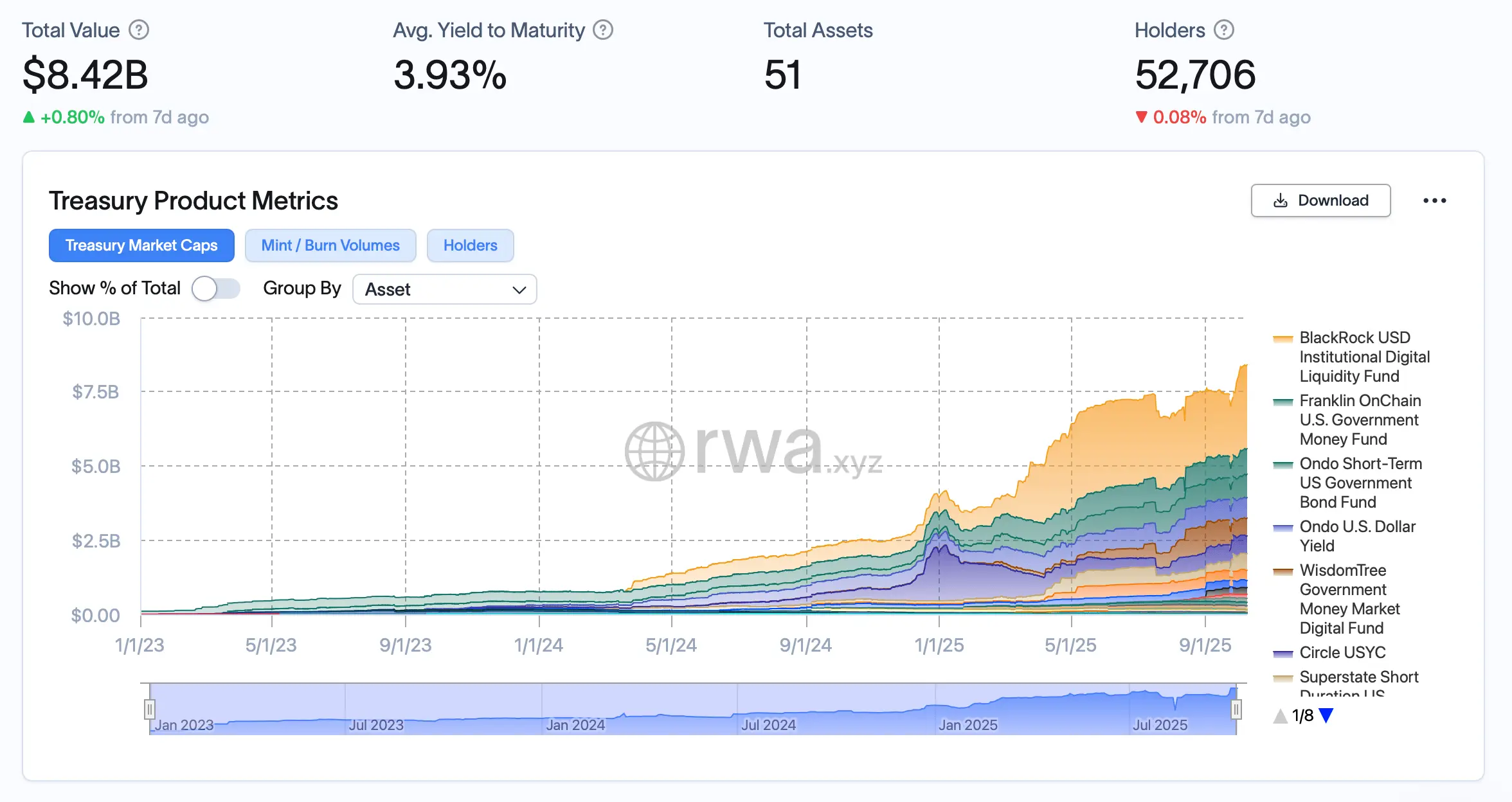 Поєднуючи традиційні фінанси (TradFi) з децентралізованими фінансами (DeFi), токенізовані казначейства переосмислюють, як інвестори отримують доступ до безпечних, які приносять дохід активів — перетворюючи державні облігації США на цифрові, часткові та глобально торговані токени. Наразі заблокована вартість усіх токенізованих казначейських фондів становить 8,42 мільярда доларів.
