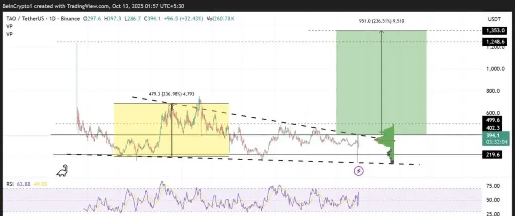 З технічної точки зору, графік цін TAO в даний час формує падаючий клин — патерн, який часто сигналізує про бичачий розворот. Зокрема, торговельна пара TAO/USDT консолідується в межах падаючого клину з жовтня 2024 року, і оскільки цей патерн наближається до завершення свого формування, потенційний прорив, здається, стає все ближчим.