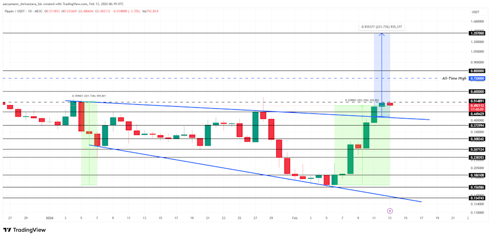 Технічно, PIPPIN проривається з нисхідного розширюваного клина, що прогнозує ралі на 221%. Підтвердженим проривом є повернення рівня 0,600 долара в роль підтримки. Хоча потенційне зростання є значним, практичною ціллю залишається подолання історичного максимуму в 0,720 долара.