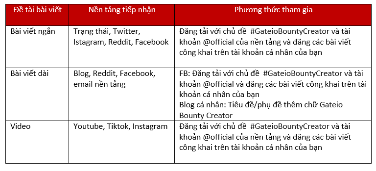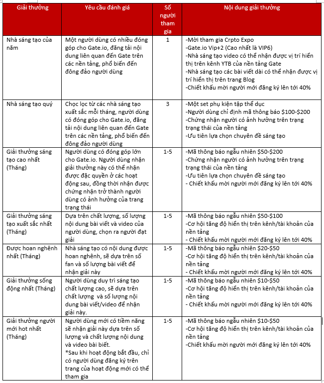 - Kế hoạch "Bounty Creator", của Gate dựa trên đăng ký tự nguyện. Gate sẽ sàng lọc thông tin do người đăng ký gửi và những người sáng tạo đủ điều kiện sẽ được nền tảng thông báo và liên lạc.
