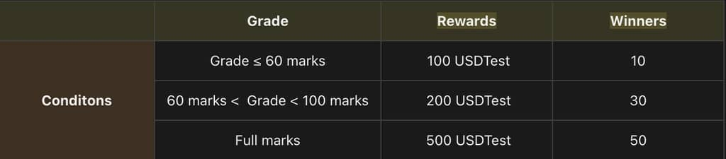 Phần thưởng cho sự kiện này được phân phối dưới dạng point và USDTEST, có giá trị trong 7 ngày và sẽ được phân phối vào tài khoản ví trong vòng 14 ngày làm việc sau khi kết thúc sự kiện. Bạn có thể xem chúng trong "Tài chính - Chi tiết thanh toán". Số lượng mã thông báo được xác định theo giá tại thời điểm phân phối. Do giá mã thông báo có tính biến động cao nên có thể tăng giá hoặc giảm giá sau khi phân phối.