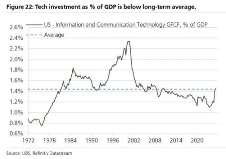 Các yếu tố thúc đẩy dài hạn chưa xuất hiện đỉnh: Báo cáo chỉ ra rằng, nhiều chỉ số dài hạn vẫn chưa cho thấy dấu hiệu đỉnh. Trước hết, tỷ lệ đầu tư vào công nghệ thông tin và truyền thông (ICT) so với GDP còn thấp hơn nhiều so với năm 2000, chưa xuất hiện sự đầu tư quá mức rõ ràng.