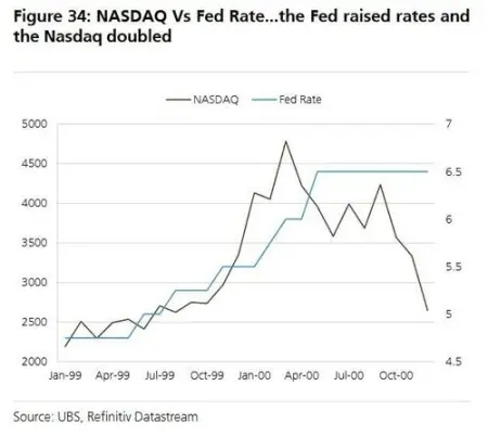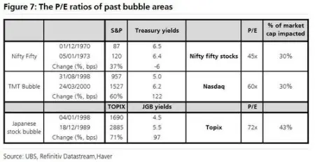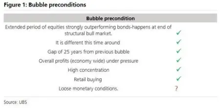 Chuyên gia chiến lược cổ phiếu của UBS, Andrew Garthwaite và nhóm của ông, trong báo cáo đã đề xuất rằng, hình thành bong bóng thị trường thường cần thỏa mãn bảy điều kiện. Họ cho rằng, nếu Cục Dự trữ Liên bang Mỹ (Fed) theo đúng dự đoán của UBS về chính sách hạ lãi suất, thì tất cả bảy điều kiện này sẽ được kích hoạt.