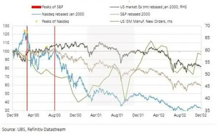 UBS đã xem xét lại kinh nghiệm sau khi bong bóng công nghệ, truyền thông và viễn thông (TMT) vỡ vào năm 2000, để đưa ra một số gợi ý cho nhà đầu tư. Trước hết, sau bong bóng, dòng vốn có thể chảy sang các lĩnh vực không bị bong bóng, trong đó các cổ phiếu không thuộc lĩnh vực TMT đã từng tăng giá trong đợt bán tháo ban đầu. Thứ hai, thị trường có thể xuất hiện hiệu ứng “tiếng vọng” hoặc hình dạng đỉnh kép. Quan trọng nhất, “khái niệm đúng nhưng giá sai”, khi cổ phiếu của Microsoft, Amazon và Apple giảm từ 65% đến 94% so với đỉnh, và mất từ 5 đến 17 năm để lấy lại đà tăng.