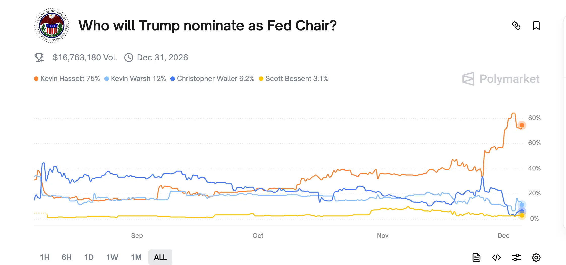Tính đến ngày 5/12, trên các nền tảng thị trường dự đoán như Polymarket, xác suất Hassett đắc cử khoảng 75%; các hãng tin lớn như Bloomberg cũng dẫn nguồn tin cho biết Hassett đã trở thành “ứng viên số một” thay thế Powell. Bản thân Trump cũng nhiều lần công khai cho biết đã quyết định, sẽ chính thức công bố vào đầu năm 2026 và nhiều lần nêu tên khen ngợi Hassett trong các cuộc phỏng vấn.