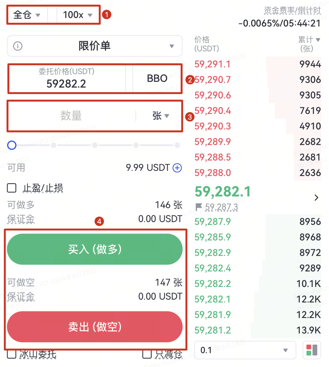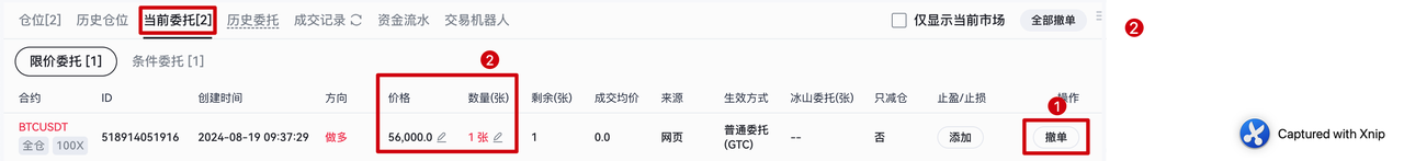 2. 合約掛單張數爲1~1000000,或者等值的幣種數量限制,不可超過限制,否則無法掛單。