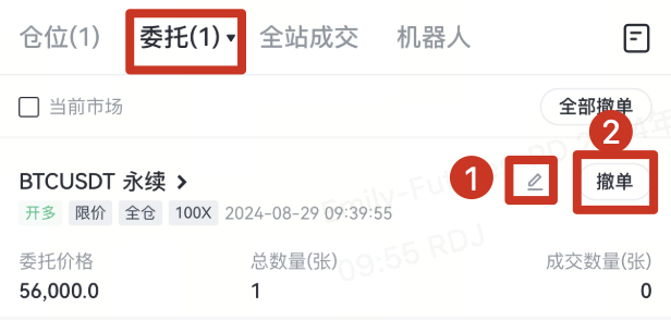 若下單後未立即成交或未全部成交,可在“委托”列表下查看。如需修改訂單,點擊①即可修改訂單委托價格和委托數量;如需撤單,點擊②即可撤銷委托。
