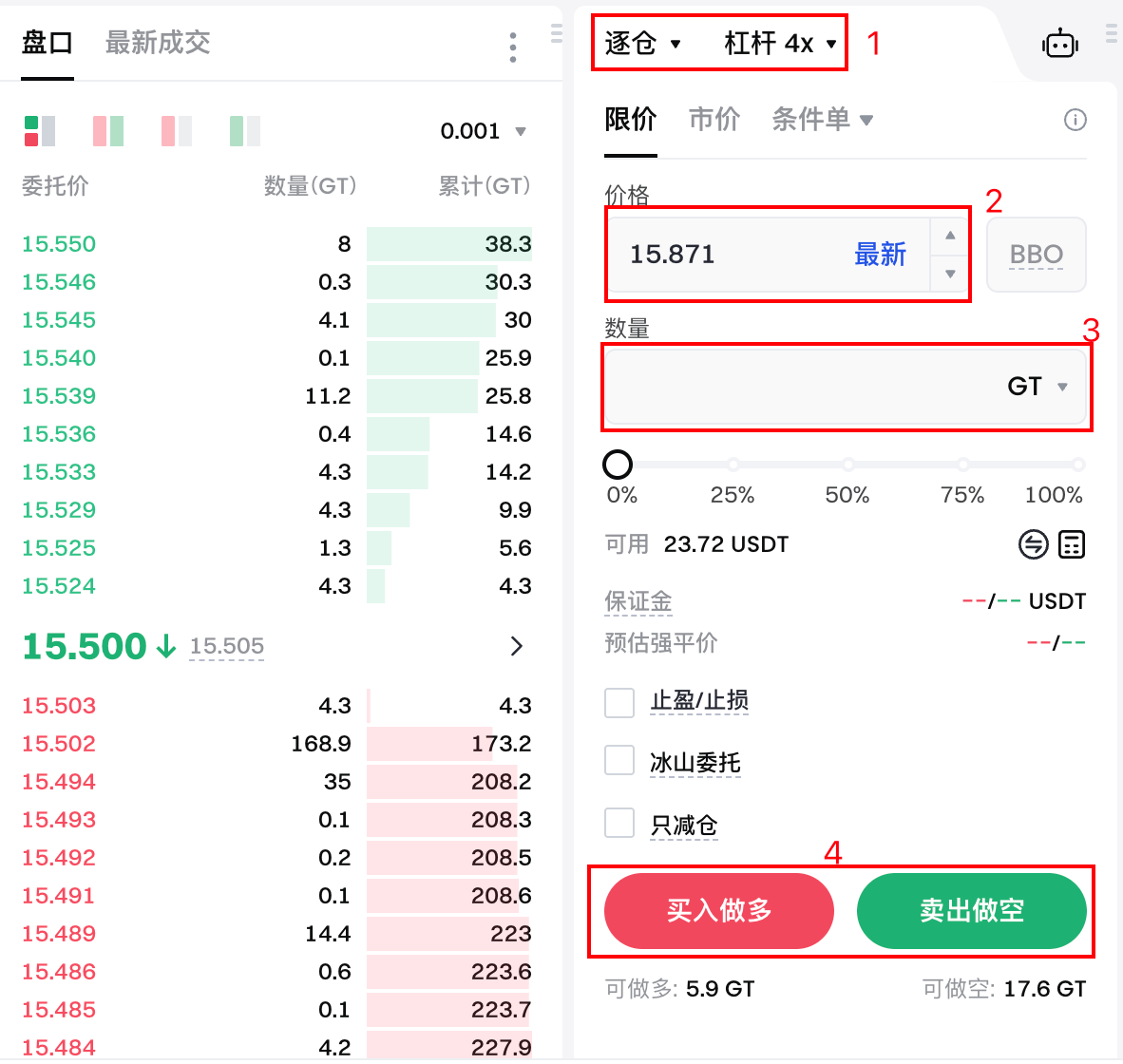 1. 點擊選擇全倉/逐倉模式和槓杆倍數;