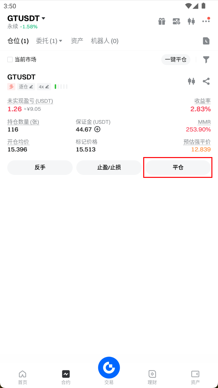 在“倉位” 列表中點擊 “平倉”按鈕 ,即可快速平倉。
