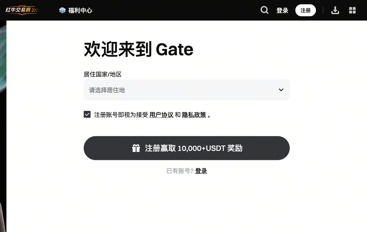 1.造訪 Gate 官網,點擊右上角的「註冊」按鈕,進入註冊頁面。在註冊頁面,依照提示填寫「居住國家/地區」,勾選「註冊帳號即視為接受 使用者協議 和 隱私政策」,點擊「註冊」。