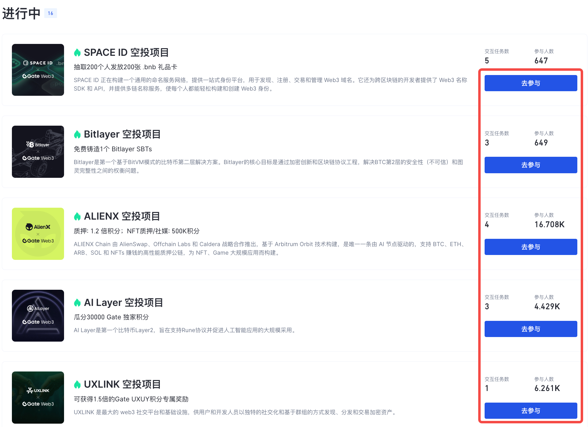 Gate Web3爲方便用戶參與空投項目,推出Web3任務廣場功能,篩選、整理出有效空投項目信息,以及交互要求,提供了空投交互任務快速路徑的一站式聚合活動。