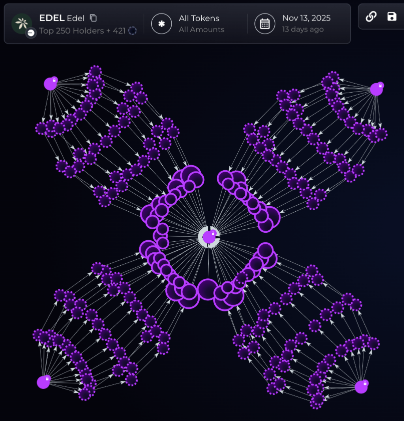 關於Edel Finance的代幣發布周圍異常活動的擔憂正在增加,這是一種集中於加密股票和實物資產的貸款協議。根據Bubblemaps,約有160個連結錢包在代幣開售時悄悄收集了近30%的EDEL供應量——目前價值1100萬美元。這些錢包據稱是通過Binance和MEXC以協調的方式收到資金,經過多層新錢包以掩蓋來源。Bubblemaps認爲,這種模式顯示出錢包組與Edel Finance團隊之間的明顯聯繫。