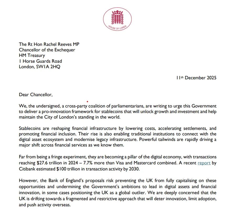 他們於12月11日聯合致信財政大臣,警告英格蘭銀行的穩定幣監管提案可能將創新和資金推向海外。