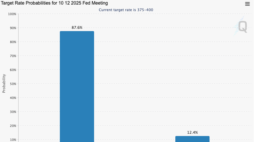 此次反彈的主要推動因素是對联准会降息的預期不斷增強。根據CME FedWatch的數據,交易者現在預計在联准会12月10日的會議上有87.6%的可能性會降息25個基點,而僅有12.4%的機會利率將保持不變。