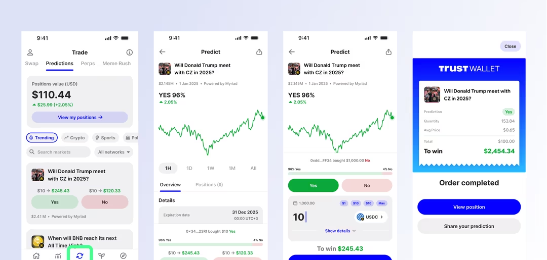 Trust 在其 Swaps 頁面上新增了 “Predictions” 選項卡,允許符合條件的用戶瀏覽市場、選擇 YES/NO 或其他結果,並在不離開應用的情況下跟蹤事件的解決。
