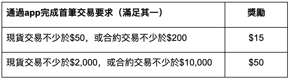 活動期間註冊的新用戶,或從5月1日00:00至6月9日09:59 (UTC+8)期間註冊但無充值或無交易的用戶,通過app完成首筆交易即享好禮,總獎池$10,000,先到先得!