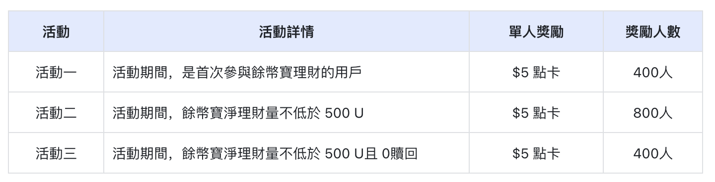 活動期間參與餘幣寶理財有机会瓜分$8,000點卡獎勵,多重獎勵可疊加領取,歡迎參與!