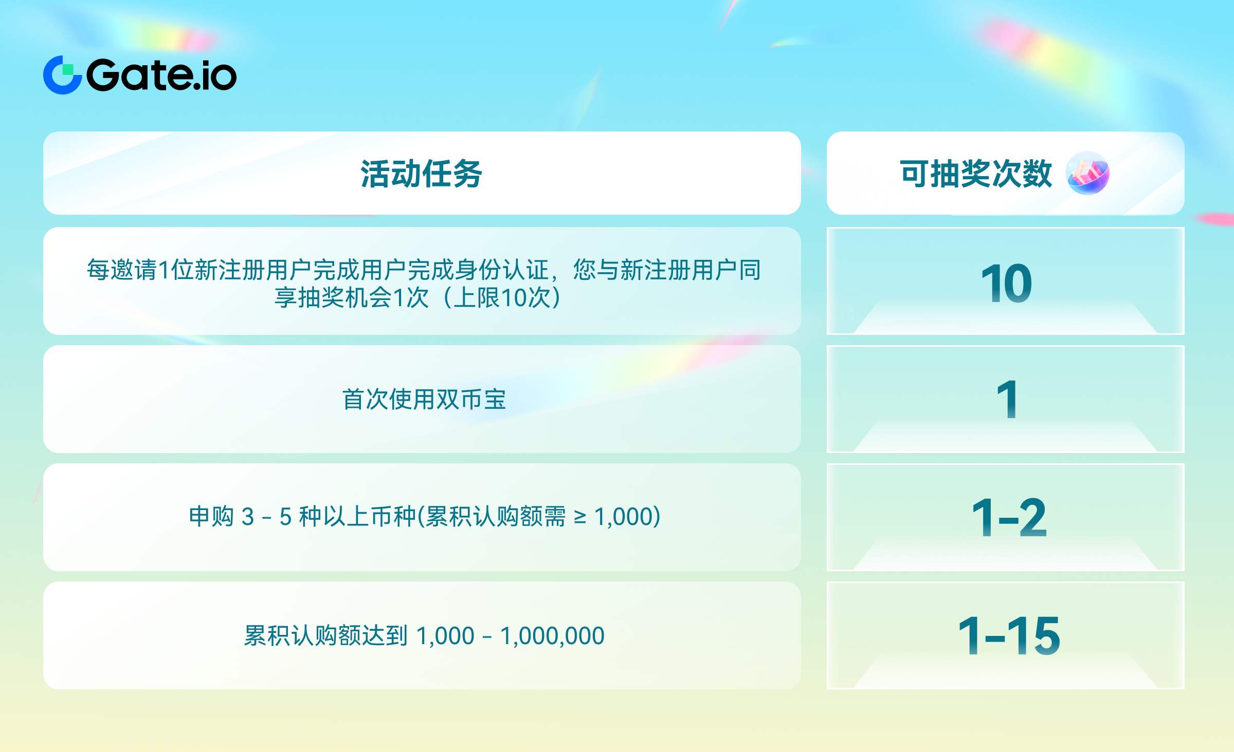 在Gate双币扭蛋挑战,我们将投资的智慧与乐趣融合在一起,创造了一个既刺激又充满回报的活动。如果你还是双币萌新,这次活动将成为你踏入双币的绝佳机会。如果你是经验十足的双币大神,别错过这一次的投资机遇,完成任务获得代币,扭蛋并解锁空投奖励。