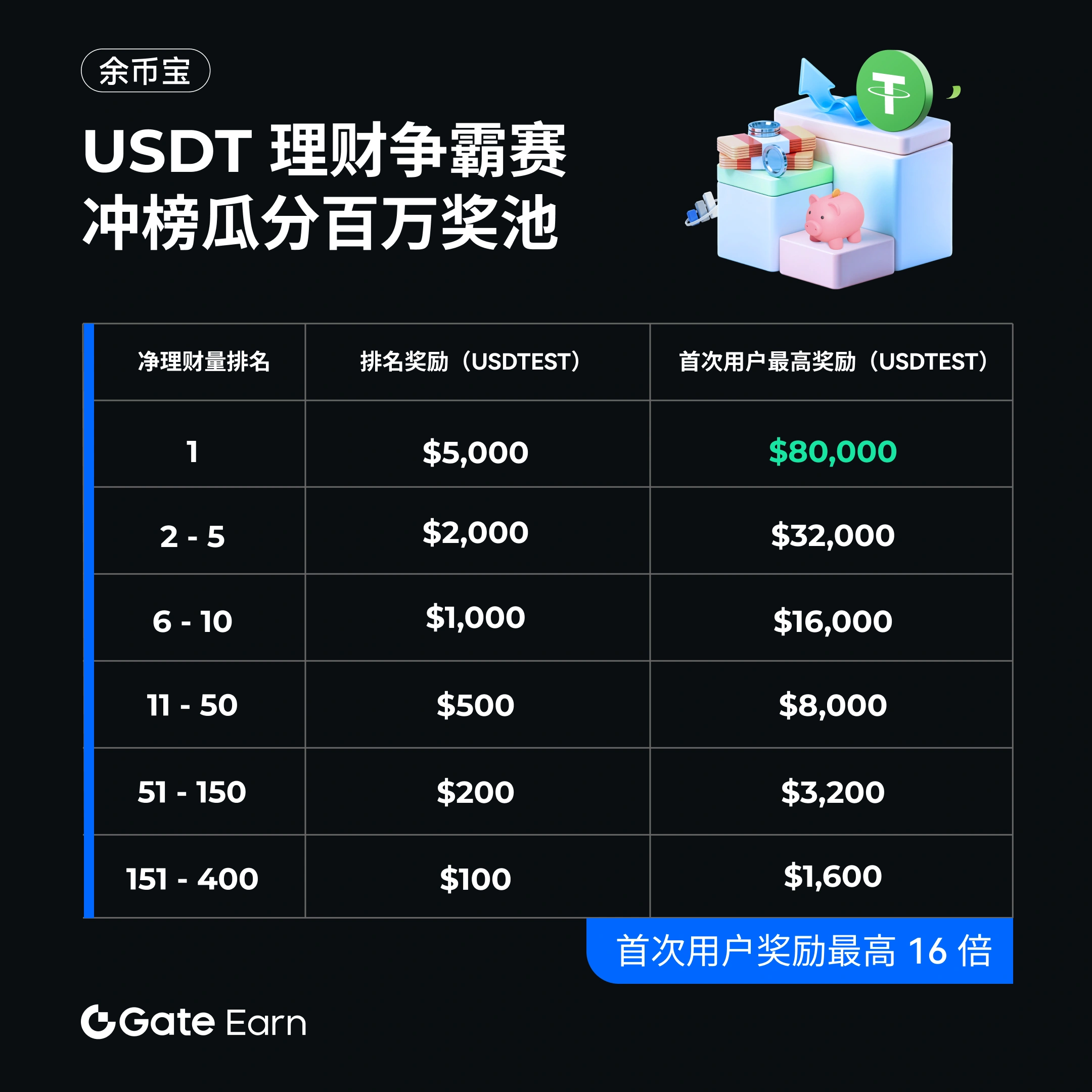 Gate 余币宝 USDT 理财争霸赛限时开启,凡报名活动且参与余币宝 USDT 活期及定期产品申购,净理财量排名前 400 名的用户即可瓜分百万奖池。余币宝首次用户最高可享 16 倍加成,最高赢取 $80,000 USDTEST 奖励。