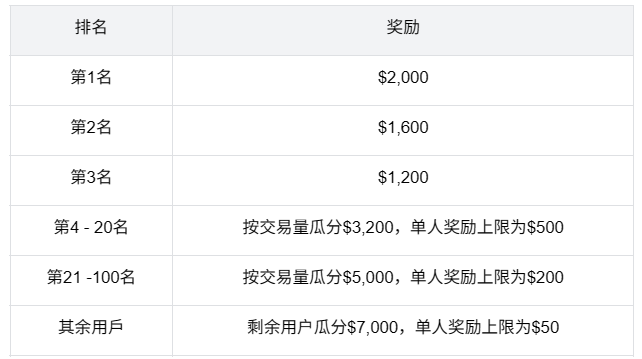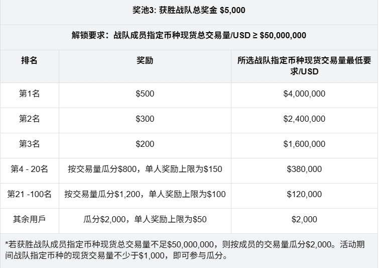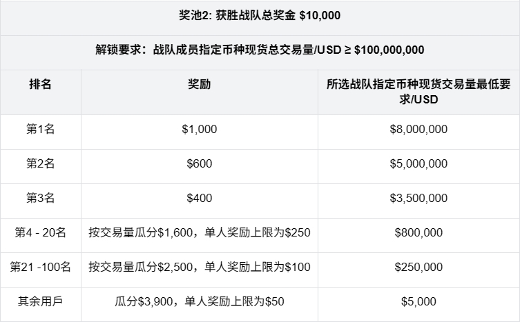 活动期间所有加入战队用户,完成不低于$1,000战队指定币种现货交易,即可按照用户现货交易量占比瓜分$2,000奖励。