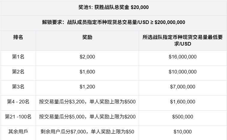 根据每个战队所有成员累积的指定币种现货交易总量进行PK,获胜战队即可解锁高达$20,000总奖池,获胜战队的成员按照本人指定币种现货交易量排名瓜分解锁的总奖池。