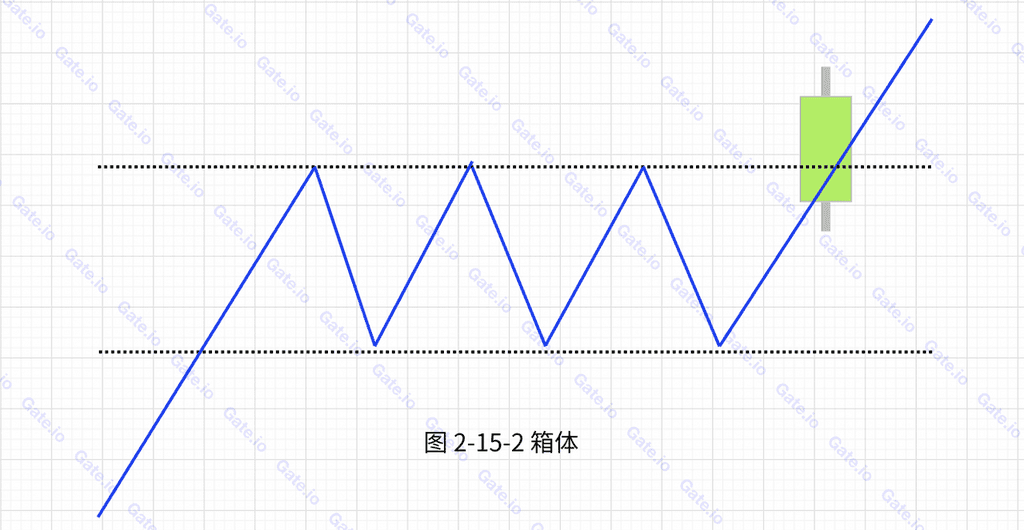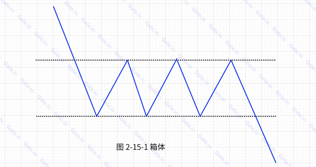 矩形又称箱体。币价每次下探时都在同一水平线获得支撑而上升,上升时都在同一水平线遇到压力而下降。连接高点和低点,就形成了矩形这一技术图形。如下图所示: