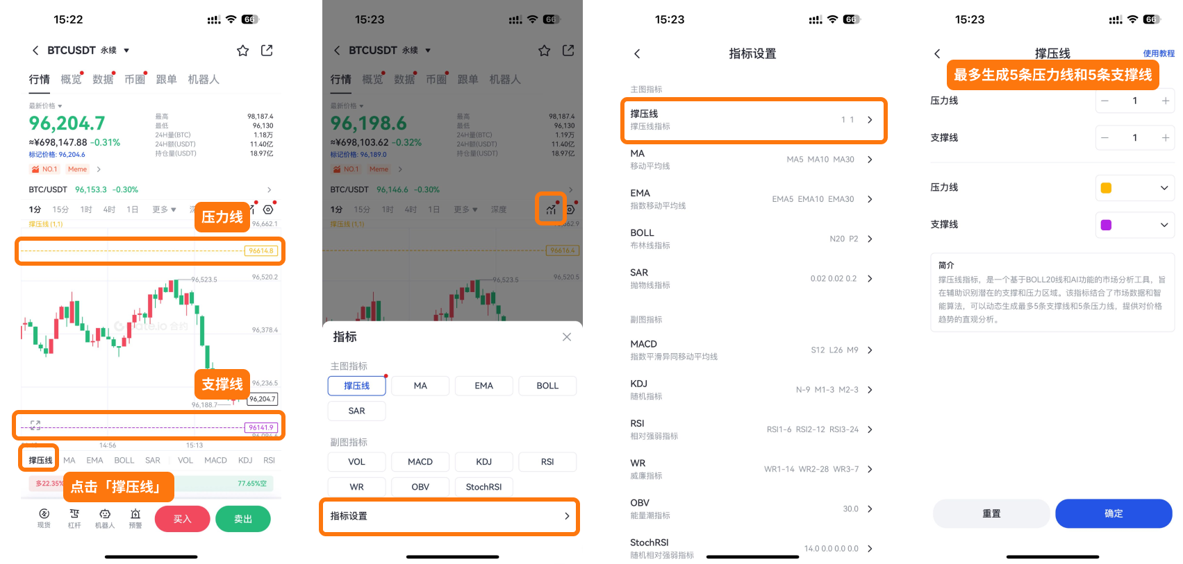 可选择设置最多 5 条支撑线 和 5 条压力线,系统会根据算法自动计算并显示。