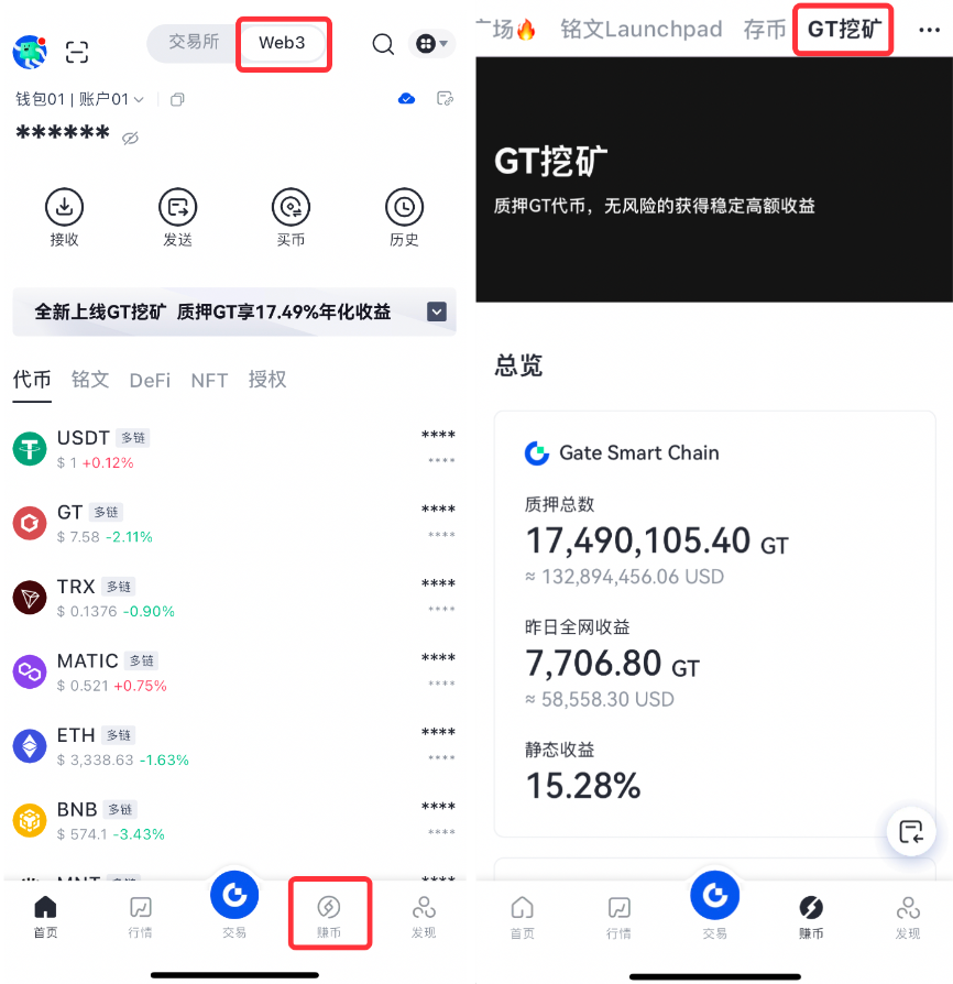 打开Gate App,点击界面上方【Web3】进入Web3界面。点击【赚币】-左滑选择【GT挖矿】。