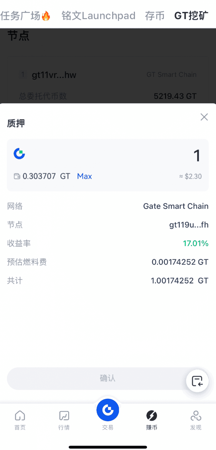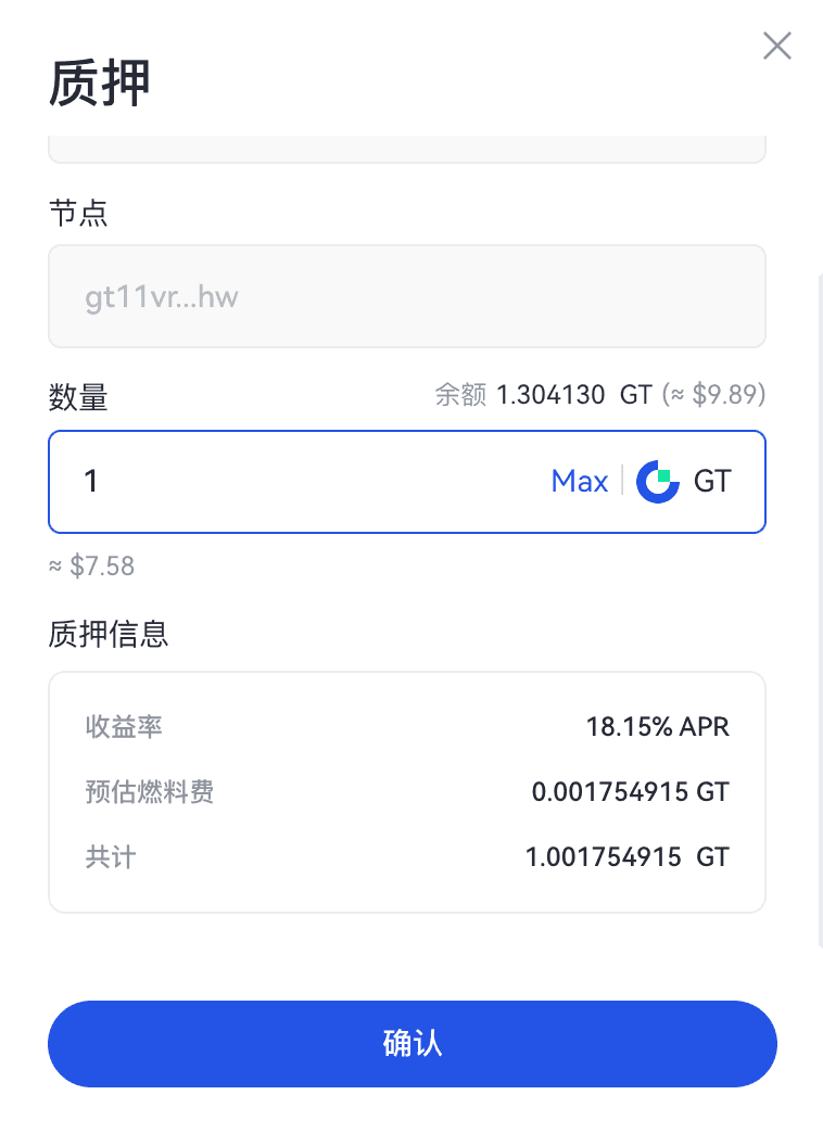 在弹窗中填入您要质押的GT数量(≥1 GT),查看、确认质押信息后点击【确认】后签名该笔交易,即可完成质押。